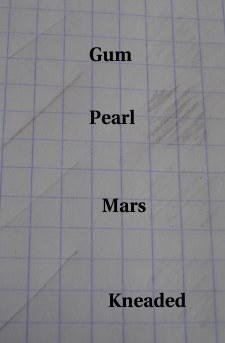 For the test, I sought brand new erasers at local stores. The Mars plastic came fully wrapped. The Pink Pearl was in a “blister pack” of three, the Lyra kneadable eraser was partially wrapped, and the General’s gum eraser was loose. The exact models used were: