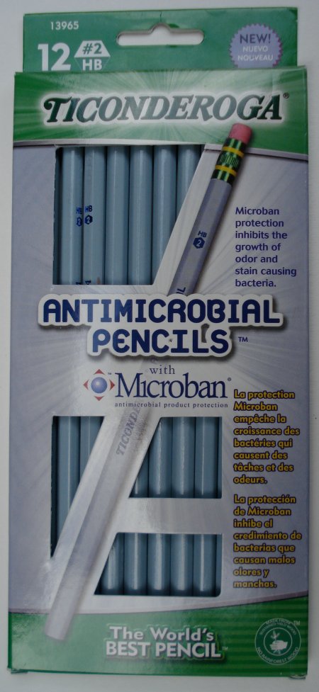 On a recent trip to a department store, I found an unusual pencil offering – “Ticonderoga Antimicrobial Pencils with Microban antimicrobial product protection.” The package additionally says “Microban protection inhibits the growth of odor and stain causing bacteria.”