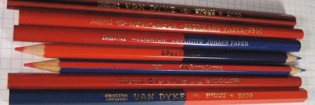 This particular pencil is hexagonal and unsharpened, with the sides alternately painted red and blue. The stamping of the name may be on either a red or blue side.